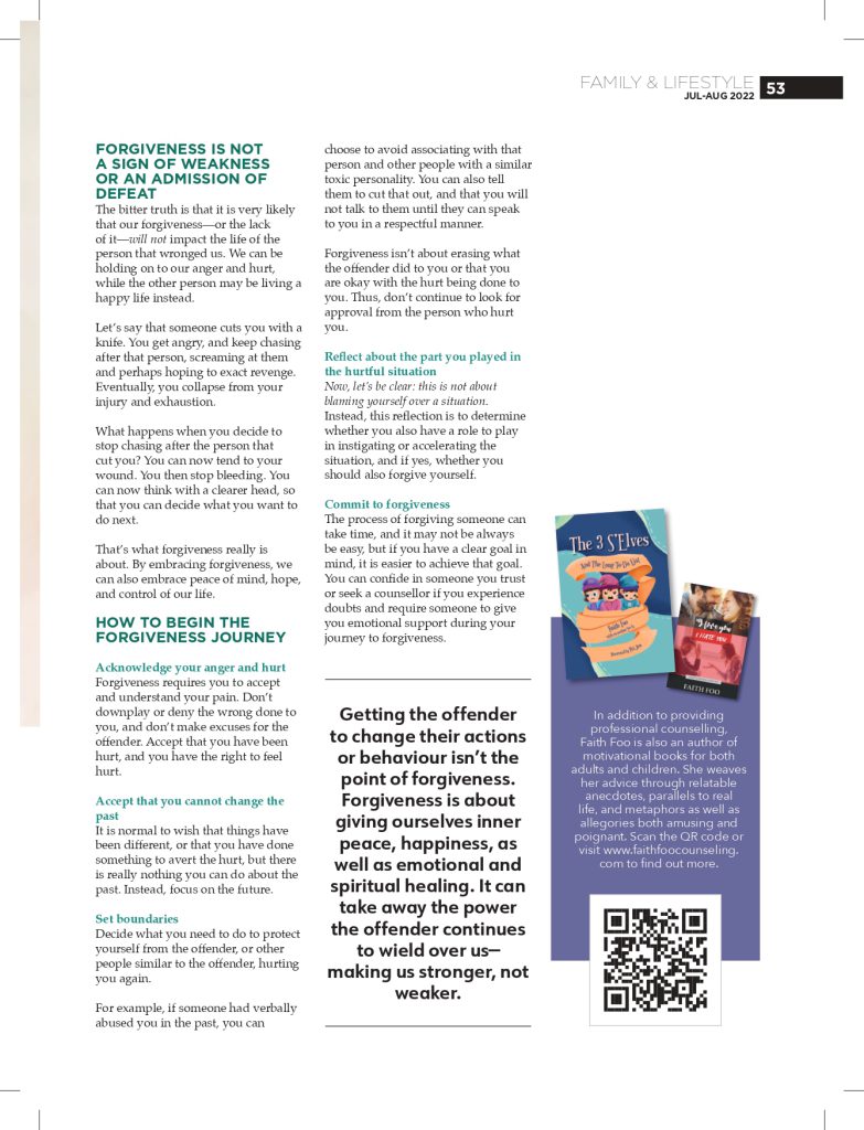 In addition to providing professional counselling, Faith Foo is also an author of motivational books for both adults and children. She weaves her advice through relatable anecdotes, parallels to real life, and metaphors as well as allegories both amusing and poignant. Scan the QR code or visit www.faithfoocounseling. com to find out more.